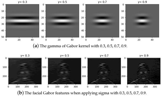 The spatial aspect ratio (): The gamma parameter () controls the ellipticity of the Gaussian function. When = 1, the Gaussian envelope is circular. However, according to Jones and Palmer [51], it has been found to vary in a limited range of . As shown in Figure 8, when increasing the value of gamma from 0.3 to 0.9, keeping other parameters unchanged, the width of the Gabor function reduces. Figure 8b shows shorter eye and mouth features.
