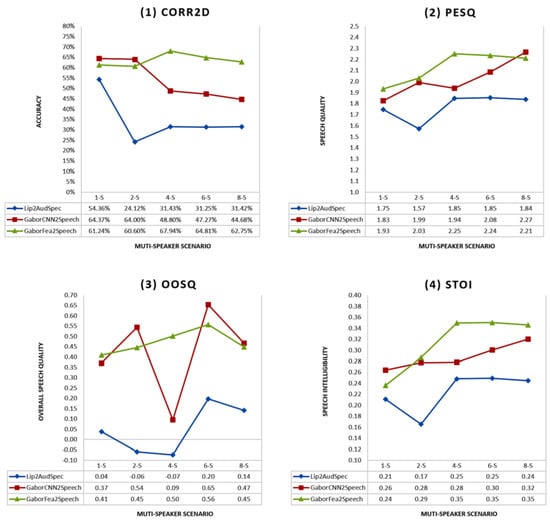 Subsequent research [38,39,40,42] focused on multi-view speech reconstruction, aiming to enhance speech quality through the integration of visual inputs from multiple angles. Kumar et al. [39] employed multiple mouth angles to estimate the LSP representation of LPC coefficients for audio. Notably, they achieved an Average PESQ score of 2.5291 for Speaker 1 (Male) and 2.6255 for Speaker 10 (Female) from the OuluVS2 database. Uttam et al. [42] extended this to multi-view speaker-independent techniques by using multi-view speaker videos and lip pose angles to identify optimal views. A decision network selected the best view combination and model for speech signal reconstruction. Their results showed a PESQ score of 1.623 and a Corr2d score of 0.816 with the OuluVS2 database.