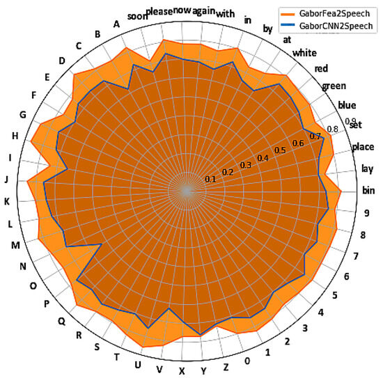 One interesting finding was that our Gabor-based features were consistently better than using a pure CNN-based method. It was hypothesised that this approach would deliver similar results but with a much smaller model, but the improvement with using Gabor features, particularly with multi-speaker models, was larger than initially expected. CNN-based approaches learn their own features, and previous research by the authors into deep learning with speech recognition [71] used the Lucid Visualisation Python Library [72] to investigate CNN-based features, finding that distinct features could be seen, focusing on areas such as the outline and thickness of the lips and the mouth and teeth opening (see Santos et al. for more details [71]. Arguably, by applying a Gabor transform, and then extracting features, there is less speaker-specific irrelevant information being learned, resulting in a reduction of the variability between different speakers. In terms of features, although we do extract the standard width and height of the mouth region, we also extract additional features, including orientation, area, and mass, which allows for a more three-dimensional representation to be constructed, which means that we are arguably still retrieving detailed information.
