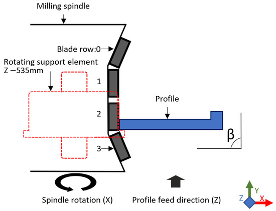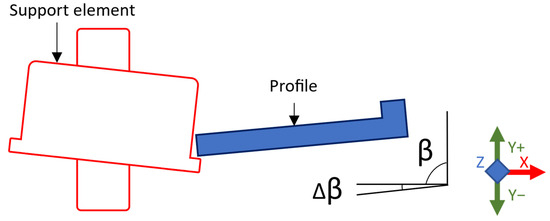 While in operation, the profile is resting on support elements on both sides of the profile, yet only the spindle side of the support element is annotated in Figure 1. The support element consists of a fixed rod and a bearing rotating the support element, which is in perpendicular contact with the milled profile. The last point of contact between the milled material and the support element occurs in the Z–direction at 535 mm before the profile contact with the milling blades.