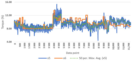 The DS1output data set is used for verifying the simulated-signal-replication capability by comparing the simulated-torque excitation to the real signal. The temporal-simulation-model results are presented in Figure 5, where the raw signal of the real torque (x5) and simulated torque (x6) trends are presented with the tested moving-average trend of 50 for x5.