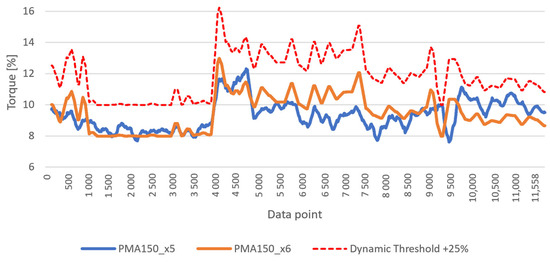 To address the natural milling-recipe changes in the simulation input variables (x1…x4), the threshold boundary for the anomaly distinguishing requires dynamic adjustment to the simulated signal. A dynamic threshold will allow the system to convey functional changes in the milling process and to adjust the threshold boundary accordingly without falsely detecting increased signal values as anomalistic behavior. However, determining the exact threshold limit is cumbersome due to the fact that the threshold for a dynamic torque anomaly can vary depending on the specific motor type, size, age, and environment. It has been discovered by [24] that variation in torque can be caused only by the rotor position changing by approximately 20% in normal conditions with a conventional control strategy. Therefore, combining the knowledge from previous research and from this study’s experiments, the anomalistic threshold boundary is set to +25% in comparison to the x6 excitation received from the simulation model. The dynamic threshold is tested with the PMA-averaged data set DS1output as presented in Figure 6, which shows no single data point crossing the dynamic threshold.