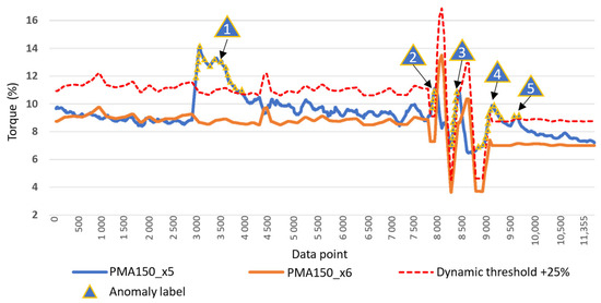 Prior moving average comparison of torque signals with dynamic anomaly-threshold boundary of +25% relative to the simulated signal x6.