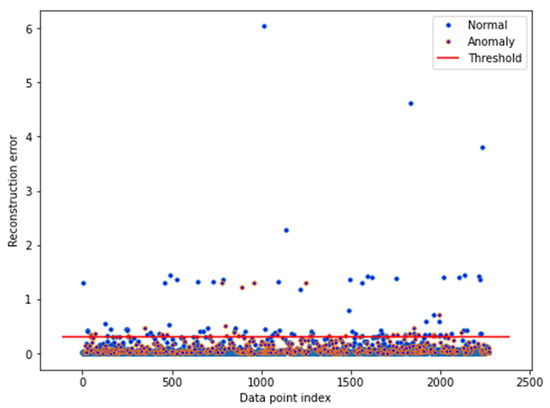 The reconstructed and classified data points for y in DS2output are shown in Figure 9. The threshold boundary in the reconstruction error refers to a point at which the autoencoder is distinguishing between normal and anomalistic data [30]. The threshold boundary for the reconstruction error is typically determined through the tuning of different constants for optimal fault-detection accuracy [31], as different values may yield different levels of accuracy in the reconstruction. The empirically found threshold level of 0.3 is selected to minimize false-negative values from the results.