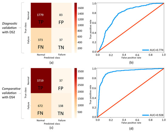 The Comparative validation results together with more comprehensive results from the Diagnostics validation and Simulation validation are presented in Table 11. Metrics to measure the binary classification method success are generally recognized to include accuracy, precision, recall, F1-score, and area under the receiver operating characteristics curve (AUC) [13,32,35,36]. Accuracy is the number of correctly classified samples from all samples present in the test set. Precision measures the proportion of correctly identified events relative to all events identified, while recall measures the proportion of correctly identified events relative to all events that should have been identified [14]. Similar to the other scoring metrics, the F1-score (also known as the F-measure) ranges from zero to one, but it is considered a more comprehensive measure to evaluate the model’s performance due to its harmonic mean of recall and precision metrics.