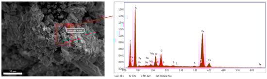 Portland cement was used in this study (CEM CPJ 45), created by mixing clinker and gypsum with one or more secondary ingredient, such as fillers, pouzzolane, or fly ash, as specified in Moroccan Norm NM 10.1.004. The representative energy dispersive X-ray (EDX) spectra of Portland cement are illustrated in Figure 2. The results indicate the peaks of this binder. It can be noticed from the spectra of EDX that the cement used in this study was mostly composed of oxygen (O), calcium (Ca), carbon (C) and silicon (Si) mixed with traces of aluminum (Al), magnesium (Mg), sodium (Na), sulfur (S), iron (Fe) and potassium (K).