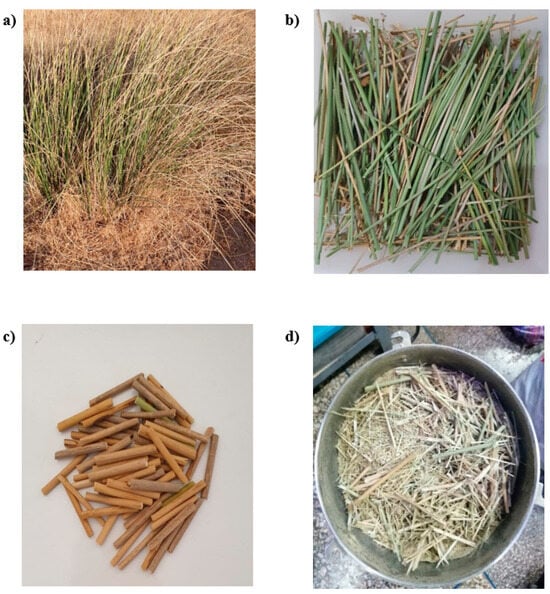 Juncus fibers: (a) Juncus plant; (b) cleaned fibers with water; (c) cut Juncus fibers; (d) ground Juncus fibers.