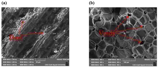 The natural fibers used in this work were from the Juncus acutus plant. Its stems have a length of approximately 1 m, with diameter of 3 mm. It belongs to juncaceae family [42], which grows in humid and wet regions of Africa, South and North America, and Southern and Western Europe [43]. The Juncus acutus plants used in this research (Figure 3a) were harvested from the same region as the soil used in this study. Before their use in the composite, fibers were cleaned with drinking water to remove the presence of any dust and impurities on their surface (Figure 3b). The fibers were dried at 50 °C for 24 h in an ambient temperature laboratory. Then, after drying, they were cut manually into small lengths of between 3 and 5 cm (Figure 3c). Afterward, the fibers were ground using a grind mixer (Figure 3d). The chemical composition of JF is presented in Table 2 [44]. Table 2 also lists the mechanical and thermal properties of the fibers determined experimentally according to ASTM C1557 [45] and a hot disc device, TPS 1500 (Hot Disk AB, Gothenburg, Sweden), respectively. Figure 4 presents the microstructure of Juncus acutus plants by means of scanning electronic micrographs (SEM). The SEM observations indicate that Juncus stems have a hairless and soft appearance with the presence of many dust particles and impurities (wax, fat, etc.) referred to as stomata and located on the surface (Figure 4a) based on longitudinal stem observation. Also, this plant has a cellular structure with pores (Figure 4b), according to SEM of the fiber cross section. The void network morphology of this kind of vegetal fiber is promising for use to develop CEB composites with better thermal performance and a low unit weight.