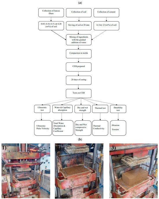 Different compositions of cement-stabilized earth blocks were prepared with different contents of fibers, as shown in Table 3. The elaboration of specimens consisted of first mixing dry soil sieved at 20 mm and cement using a driven mixer for 20 min, and then gradually adding the dry fibers to the mix until a homogeneous mixture was obtained. Subsequently, water was added gradually at a quantity determined by the proctor test, thus accounting for the water demand for cement to estimate its effect on the stabilization of the earth blocks. Afterward, the mixture was put into steel molds and compressed at a compaction pressure of 10 MPa. After demolding, the drying of the samples took place in normal laboratory conditions at 20 ± 2 °C with a relative humidity of 98% for approximately 28 days until constant weight, and to avoid unwanted waiting, the blocks were cured at 105 °C for 24 h before testing (Figure 5a). The main steps for the production of the CEBs are presented in Figure 5b.
