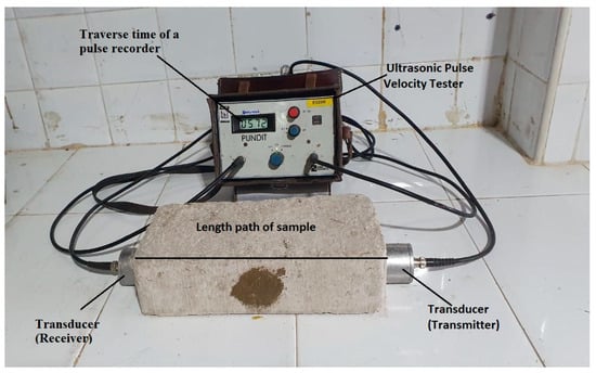 The ultrasonic pulse velocity (UPV) was evaluated on samples as specified in Standard NF P 18–418 [44]. This non-destructive test is based on the propagation of ultrasonic waves in the tested material. Thus, the time transmission was measured using a UPV tester (Figure 6). The velocity of the pulse through the specimen was evaluated using Equation (1):