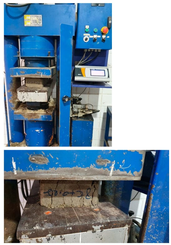 The compressive strength was conducted on three samples from each mixture prepared. This test consisted of applying a compressive load continuously and without jerking to the hardened block until failure (Figure 8). The maximum load supported by the specimen during the test was recorded by using a Hydraulic IGM—France machine with a maximum load capacity of 3000 KN. Tests were carried out at a pressure increase of 0.15 MPa/s until the complete rupture of the specimen. Then, the compressive strength was calculated on each block according to Equation (4):