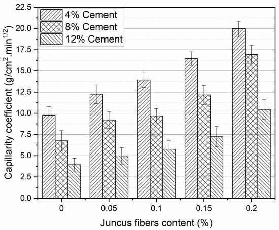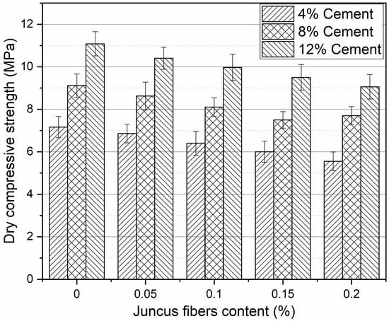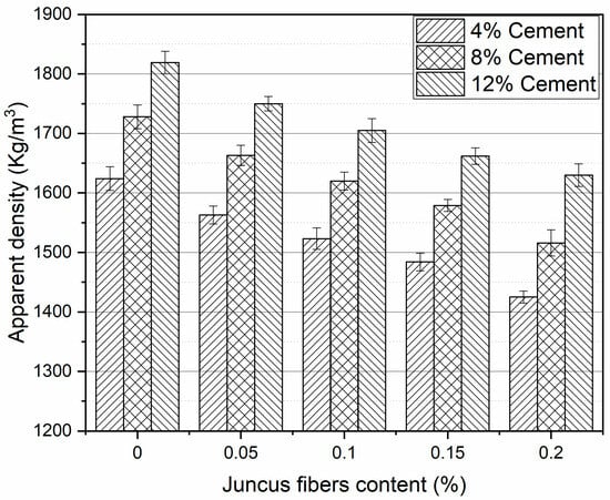 The density of CEBs has several effects on their properties and suitability for building applications. The effect of density on strength, durability, thermal or sound insulation depends on the composition of the mixture and the compaction method. It is interesting to understand how the addition of fibers into the mix modifies CEBs’ properties. In this work, the apparent density of the blocks was evaluated using the ratio between the weight of the dried specimens and their volume, which was evaluated according to their dimensions. Figure 10 illustrates the effect of fiber content and cement ratio on the apparent density of hardened blocks. It was highlighted that these values varied from 1425 Kg/m3 to 1819 Kg/m3. As expected, there was a reduction in apparent density with increasing fiber content for all specimens compared to the specimens without fibers. It should also be noted that for the block with 12% cement content filled with 0.2% JF, a decrease of 11.6% was noticed in comparison with that with the same content of cement without fibers. This reduction could be explained firstly by the physical properties of Juncus plant fibers, considering their lower density (1.8 g/cm3) compared to the soil–cement matrix, and secondly, the lightening of the earth blocks could also be attributed to the great capacity of fibers to absorb water (225%), which increases the composite porosity during the drying process of the produced CEB. Therefore, it can be concluded that the first benefit of incorporating natural fibers into soil–cement composites is the production of a lightweight specimen. This trend has already been reported by previous works [27,28,47,48] on earth brick composites reinforced by vegetable fibers. On the other hand, it can be noticed from Figure 10 that an increase in the cement content from 4% to 8% leads to an increase in the apparent density value of approximately 5.5%, and the same behavior is observed (5%) for an increase in cement from 8% to 12%. This confirms that the increase in cement content leads to an increase in the block apparent density.