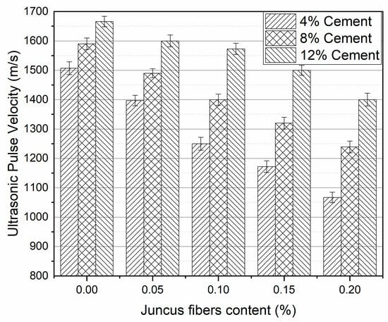 The ultrasonic pulse velocity (UPV) test was conducted to assess the porosity of the CEB and its capacity to absorb sound. Table 4 shows the effect of fiber incorporation on the UPV. Figure 11 also presents the variation of UPV as a function of JF content for different percentages of cement stabilization. It was clearly observed that UPV decreased significantly when the JF content in the composite increased. It is important to note that the lowest value was observed for the sample with a content of 0.2% JF and 4% cement stabilization, which exhibits a reduction of about 36% compared to the non-filled sample with 12% cement stabilization. The variation between the highest and lowest values of UPV is approximately 40%, 28% and 20% for cement contents of 4%, 8% and 12%, respectively. These findings indicate that the composite filled with JF has the ability to decrease the speed of sonic waves’ propagation. Therefore, the addition of Juncus fibers improved the capacity of CEB to absorb ultrasonic waves and promote the damping vibration, which allows us to obtain a high level of sound insulation. These results could be attributed to the increase in the composite’s porosity by adding vegetable fibers, since the speed of wave propagation in solids is higher than in voids, and also the low UPV of Juncus plants. Similar findings have been highlighted in the literature [27,49,50,51]. These studies confirmed that building materials including vegetable fibers have good sound absorption characteristics. Figure 11 also shows the influence of cement content on UPV. It can be noticed from the results that the increase in the cement content from 4% to 8% and from 8% to 12% increased the average value of UPV by about 10%. Based on these results, the increase in UPV could be explained by the increasing amount of calcium silicate (C2S and C3S) created by the increasing cement content. The increasing quantity of these hydrates, which originate from cement hydration, reduces the void network in the matrix and improves its compactness by assuring good bonds between fibers and soil particles, in turn reducing the porosity of the earth block, providing the highest value of UPV.