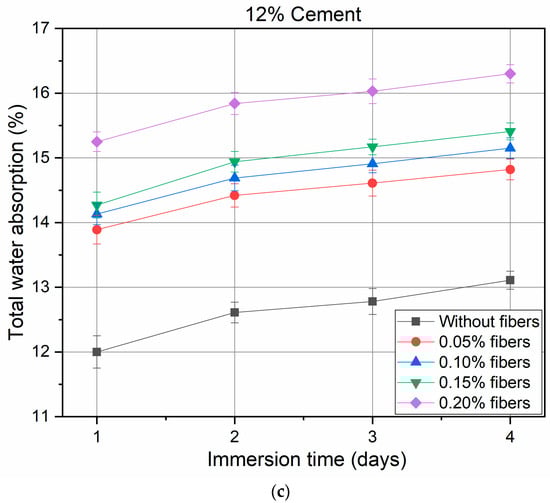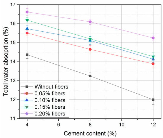 The variation of the total water absorption (TWA) for one day of immersion as a function of cement content for different fiber substitution levels is shown in Figure 12. A decrease in TWA with an increase in cement content can be observed. For blocks without fibers, the value of TWA varied between 14.37% for 4% cement and 12% for blocks containing 12% cement. This corresponded to approximately 19%, which can be attributed to the capacity of cement to fill voids and reduce the porosity between soil particles and fibers, and then decrease the infiltration of water into the composite.