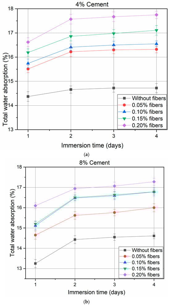 The evolution of TWA as a function of immersion time is presented in Figure 13. Based on the obtained results, the specimens without fibers display less TWA than blocks reinforced with fibers. It is crucial to note that the majority of water was retained during the first two days, while over the following two days, the evolution of TWA was insignificant, considering that the increase in its value did not surpass 2% for all of the compositions. Moreover, it should be noted that the introduction of fibers increases the TWA, which means that there is more infiltration of water into the specimens. This behavior could be explained by the capacity of fibers to absorb water, which is related to their hydrophilic constitution composed mainly of cellulose and hemicellulose and also their porous network structure.