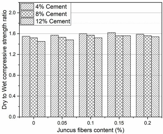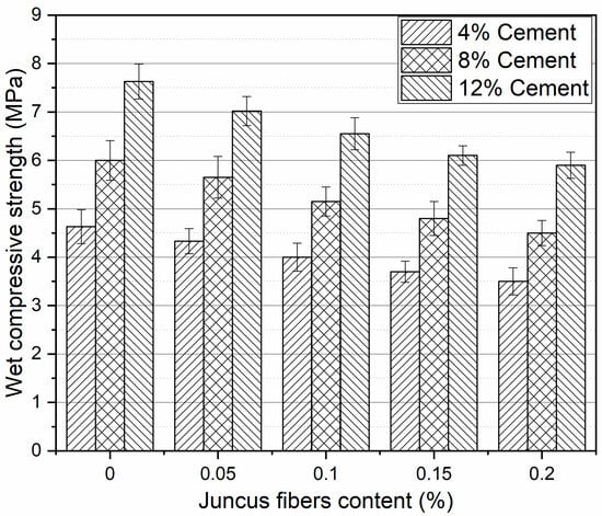 - The incorporation of JF from 0 to 0.2% results in a moderate decrease in the compressive strength of CEBs. Meanwhile, increasing the Portland cement content leads to an increase in the wet and dry compressive strength.