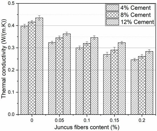 Figure 18 depicts the thermal conductivity results as obtained for different fiber contents and for three cement contents. From the graph, it can be noticed that the increase in cement content leads to a slight increase in the value of thermal conductivity. The effect of JF content on thermal conductivity is shown in Figure 18. The values of thermal conductivity ranged between 0.2465 W/m·K and 0.4350 W/m·K. The highest value corresponds to the sample with a cement content of 12% without fibers, whereas the lowest value corresponds to the sample with a cement content of 4% and a fiber content of 0.2%. The graph indicates clearly that an increase in fiber content leads to a decrease in the value of thermal conductivity. In comparison to the non-reinforced blocks, the thermal conductivity of CEBs reinforced with 0.05%, 0.10%, 0.15% and 0.20% Juncus fibers and stabilized with 12% cement was 16.6%, 20.40%, 25.4% and 34.7% lower, respectively. These results could be explained, on the one hand, by the increase in blocks’ porosity with incorporation of JF, making the CEBs more insulating, and on the other hand, the insulating effect of Juncus fibers, since they have a low thermal conductivity of 0.0756 W/m·K in comparison to the earth–cement matrix. It is clear from these findings that the reduced thermal conductivity of JF produces less conductive blocks. These findings are consistent with the results reported by several researchers [56,57,58] in their works conducted on the incorporation of vegetable fibers into earth blocks. For example, the research work carried out by Garrouri et al. on earth composites reinforced with alfa fibers of different contents (0%, 7%, 11% and 15% vol) identified a decrease in thermal conductivity of approximately 13.1% [27].