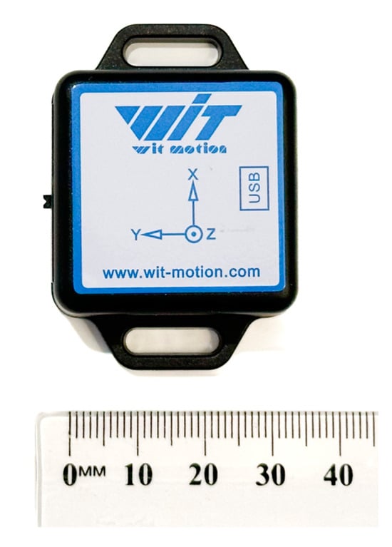 The wearable device, WT901BLECL, is a commercially available IMU sensor from Wit-Motion©, WitMotion Shenzhen Co., Ltd., Shenzhen, China (Figure 2), which offers wireless data transmission via its built-in Bluetooth chip nRF52832 and has a built-in 260 mAh rechargeable battery. The model WT901BLECL was selected because of the reasonable performance of its embedded motion sensor MPU9250 at measuring rotation, angular velocity, and acceleration in x, y, and z directions, as well as its compact form factor and light weight, making it easy to attach to participants’ bodies with Velcro-style strapping, eliminated the need for cables, enhancing user comfort and mobility. When the IMU unit was attached to a participant’s body, its x-axis rotation was about the human anatomical sagittal plane, while its z-axis rotation was about the frontal plane. The IMU also has built-in Kalman filtering that removes noise from the raw data it records, thereby enhancing the accuracy of the results. As illustrated in Figure 1, the IMU captures the participant’s movement data. Then, the digitalized signal is transmitted over Bluetooth to an ordinary laptop computer. MATLAB (R2022b) was used on the computer to ingest the data and extract the features to trigger the sonification process. Once a trigger is received, the Max© (version 8) software by Cycling’74 will generate a sonified signal. This signal can be played back to the participant either through the computer’s speakers or transmitted via Bluetooth to headphones.