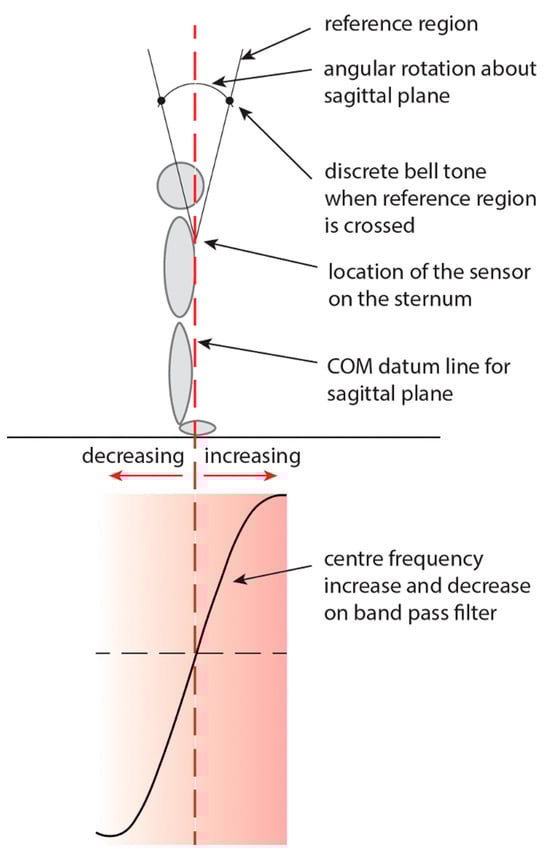 The auditory feedback used in this study combined continuous and discrete tones to indicate the participant’s balance state. The discrete tone was a bell sound triggered by the participant rotating outside the reference region, as illustrated at the top of Figure 3. The reference region was based on a 5% rotational deviation on either side of the reference datum collected in the calibration process. The continuous tones were shifted via an increase or decrease in the center frequency of a bandpass filter over a selection of tuned oscillators. The auditory effect was to brighten the tones as the rotation increased away from the reference region or, conversely, dull these tones as the rotation decreased in the region through the sagittal plane of movement, as shown in the lower half of Figure 3.