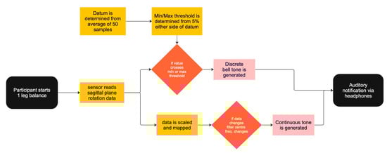 Cueing movement with auditory feedback that changes outside a reference region follows the approach used by [,]. In those studies, an auditory sinusoidal tone was increased in frequency when the participant accelerated in the anterior direction and decreased when the participant accelerated in the posterior direction whilst trying to balance. We sought to implement our sonified signal based on this relationship, as it has been demonstrated as a promising approach. In this study, we further improve it by combining continuous tones that were brightened as the rotation increased or conversely dulled as the rotation decreased, with a discrete bell tone that signaled the movement outside of the reference region in the sagittal plane. Figure 4 shows the proposed flow structure for retrieving data from the sensor and providing sonification to the user.