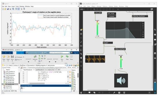 The auditory feedback system has been designed and configured to ensure seamless interaction between the IMU sensor and MATLAB, subsequently bridging MATLAB with Max. Figure 5 presents how this data transfer precipitates a dynamic alteration in the audio output, which is visualized in real-time with MATLAB’s plotting functions.
