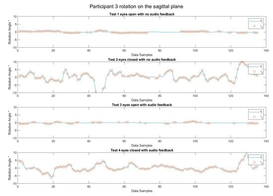 The effectiveness of the proposed system in aiding participants in returning to their reference region was evident in the results. Upon analyzing the audio files generated for Tests 3 and 4, a few initial observations can be made. In Test 4, the bell tone provided a clear indication when the reference region was exceeded; this was a clear cue for the participant to return to the reference region, and this correction took a mean of approximately 5 s compared to a mean of roughly 15 s in settings without auditory feedback. The continuous sound, represented as a sharpening tone before the bell tone, provided a cue to participants to anticipate the reference region boundary. Specifically, in Test 3, the bell tone only signaled one reference boundary crossing. The eyes-open condition did not require the auditory sense as much as that of closed eyes. This was most evident when comparing the time series graphs of the rotation angles for Tests 3 and 4 (Figure 6 and Figure 8).