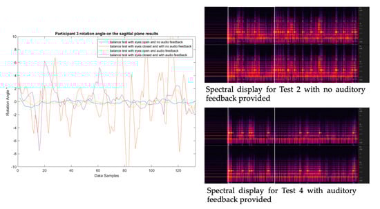 Figure 7 presents the spectrogram for Test 2 and Test 4, without and with auditory feedback, respectively. Without auditory feedback to inform the participant about their movement, the spectral display’s brightness is relatively continuous and uniform. This indicated that without auditory stimulus, the participant was unaware of the position relative to the reference region and hence did not elicit any change in their movement. Conversely, when auditory feedback was provided, bright and discrete flashes at specific intervals signified the bell tones triggered when the participant’s movement deviated from the sagittal plane’s reference region. These bell tones served as auditory cues, informing the participant of their movement’s misalignment with the desired range. The periodic appearance of these bright markers against the darker background of continuous frequencies demonstrates the feedback system’s functionality in alerting the participant through discrete auditory signals.