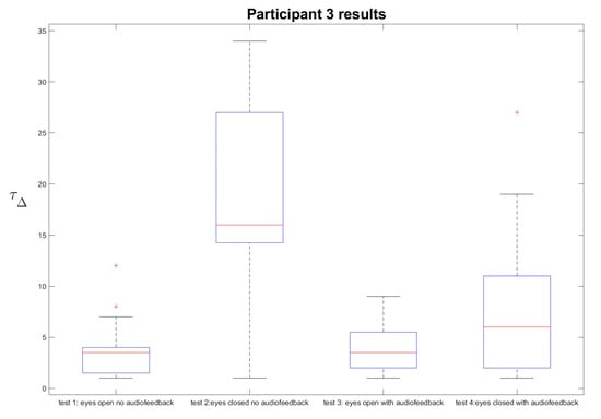 Here, we analyzed how the participant responded to the auditory feedback in the four test conditions. All four participants engaged in each of the four tests to maintain consistency across the data set. Generally, we found that Test 4, eyes closed with auditory feedback, had a greater effect across the participants when compared to Test 2, eyes closed with no auditory feedback. Figure 6 shows that the deviation from the reference point in the x dimension can be visually seen as less in Test 4 when auditory feedback was provided than in Test 2.
