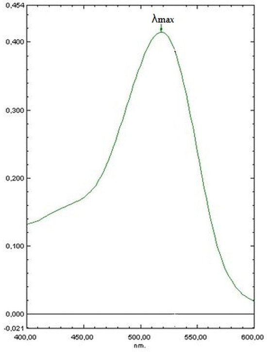 An example of the spectrum obtained in the wavelength range of 400–600 nm for extracts obtained from blackcurrant pomace. λmax = 520 nm.