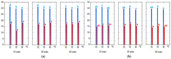 Lightness (L*) (a,b) of the extracts. Blue bars—material/solvent ratio 1:20, red bars—material/solvent ratio 1:7; (a) extracts obtained with water–ethanol (50/50 v/v) solvent; (b) extracts obtained with water–citric acid solvent. The values with different letters within the same color are significantly different (p < 0.05).