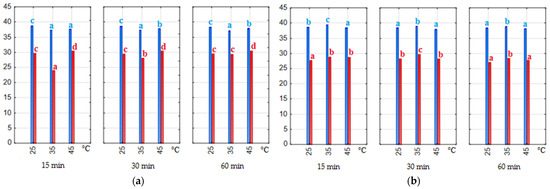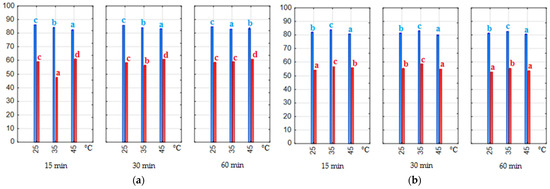 The parameter h° defines the hue of the color. It is defined by degrees of the angle starting from the positive side of the a*-axis and proceeding counterclockwise on a circle, and forming the following ranges: from 0° red, through 90° yellow, 180° green, 270° blue to 360° red. The hue h° of the water–ethanol extracts ranged from 37.1 to 38.7 (1:20) and from 23.9 to 30.4 (1:7). However, the h° value of water–citric acid extracts was 37.9–39.4 (1:20) and 26.9–28.7 (1:7). Therefore, all extracts were in the hue zone of the red color. The structure of anthocyanins strongly depends on the pH of the matrix, and all extracts had a pH in the range of 1.5–2.6, where anthocyanins are present in the form of red flavylium cations. In addition, the value of the parameter h° was affected (p < 0.05) by the ratio of pomace to solvent (Figure 4a,b). Extracts obtained with a ratio of 1:7 had a more intense red hue due to the higher anthocyanin content. Statistical tests showed that if the extraction time and temperature increased, the hue value was also higher (p < 0.05). For this color parameter, Pearson’s correlation test also showed a very strong relationship with the anthocyanin content of the extracts (−0.997 and −0.993 for water–ethanol and water–citric acid extracts, respectively).