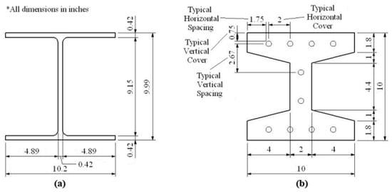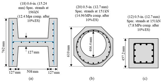 UHPC pile research to date has mostly aimed at developing UHPC pile details to replace steel H-piles. A summary of the UHPC pile cross-sections that have been or are currently being investigated is shown in Figure 2 [13,43] and Figure 3. There is ongoing research by the Alabama Department of Transportation (ALDOT) and the Prestressed/Precast Concrete Institute (PCI) investigating prestressed UHPC H-piles; these works are investigating 12-inch (305 mm), 14-inch (355.6 mm), and 16-inch (406 mm) UHPC H-piles with high precompression. Figure 2b [43] shows the details of two of the UHPC H-pile sections. Figure 2a [13] shows a section of a completed research work conducted at Iowa State University.