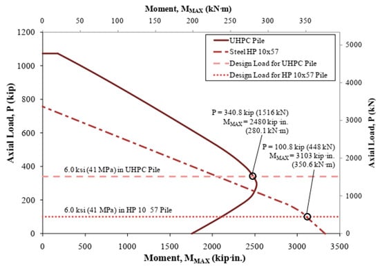 Moment–axial load interaction diagram for UHPC and HP 10 × 57 pile sections with equivalent axial load [13].
