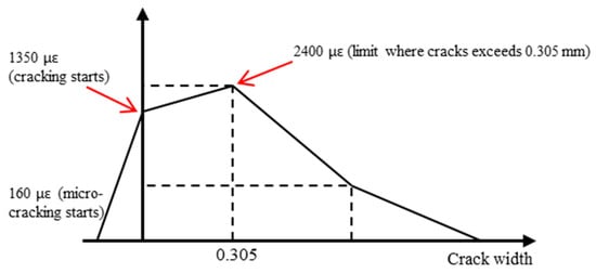 Garder et al. [41] also investigated the cracking performance of UHPC piles, as the piles would lose their long-term durability performance if cracking was to occur. They assumed a strain versus crack width relationship, as shown in Figure 6 [13,41]. Based on the results from Voort et al. [13] for the strains when micro-cracking started, cracking started when cracks exceeded 0.012 in. (0.305 mm).