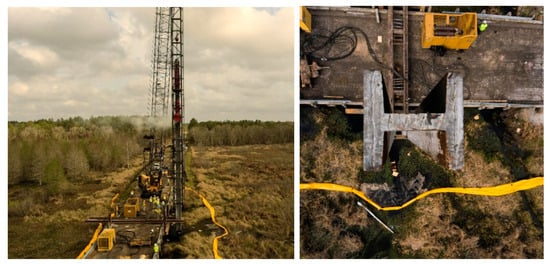UHPC piles have already been used in several construction projects. They were used for one abutment for Lily River Detour Bridge (Highway 11) in Ontario, Canada, in 2020 [45]. One abutment utilized UHPC H-piles, and the other abutment implemented steel H-piles with the same outside dimensions. Photographs of the bridge during construction are shown in Figure 7 [45].