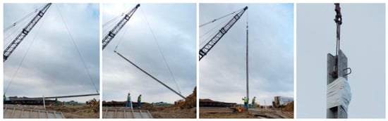 Garder et al. [41] reported the field implementation of a single UHPC H-pile on a bridge project in Sac County, Iowa, near the intersection of US 20 over US 71. The bridge has three spans, a total length of 6.1 m, 12.2 m width, and 24-degree skew. The lifting and installation process is illustrated in Figure 9 [41].