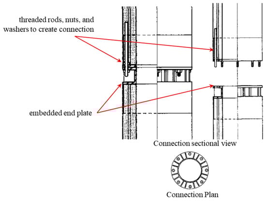 The Japanese bolted splice discussed by Bruce and Hebert [15] includes an embedded end plate with threaded rods extending into the splice region and creating the field splice, as shown in Figure 12 [15]. The end plates have recesses in the concrete that provide spaces for tightening the bolt hex nuts and threaded rods.