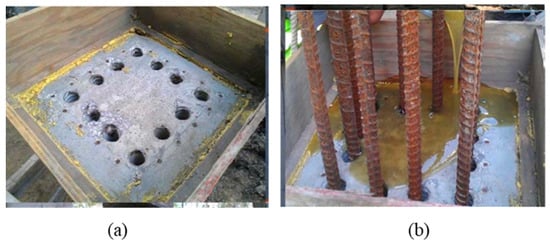 Epoxy-bonded dowel splices: (a) drilled holes at the pile segment; (b) rebar dowels with epoxy [53].