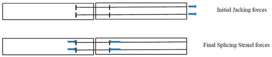 Post-tensioning ducts can be used to form a connection between two pile segments. Splice is achieved by running post-tensioning strands through this duct across the two-pile segment. The strands are then tensioned and stressed to form connections. Post-tensioned splices can increase the tensile capacity near the ends of the prestressed pile and the splice region [52] and provide good bending and tensile strengths [17]. Mullins and Sen [14] developed a post-tensioned splice detail where embedded anchors are provided in the ends of the piles (dually embedded anchors), as shown in Figure 15 [14].