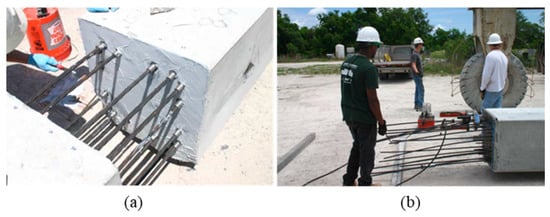 Epoxy-bonded dowel splices are created by casting or drilling holes in the top of the lower pile to receive dowel rebars protruding out of the lower end of the upper pile. Dowel bars can be made of carbon steel, stainless steel (SS), carbon fiber-reinforced polymer (CFRP), or glass fiber-reinforced polymer (GFRP). The dowel rebars must have adequate length to bond with the other pile segment. Different types of resin and cementitious grouts can be used as filler and bonding agents to connect the pile segments [52,53].
