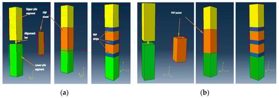 The FRP sheet/jacket concept has been introduced by Khedmatgozar Dolati and Mehrabi [47,50] as an innovative alternative to the existing methods for connecting driven pile segments both in preplanned and unplanned situations. The splicing system consists of an alignment bar and FRP sheet (layers of carbon fiber-reinforced polymer or glass fiber polymer), which are bonded to the pile segment with resin/epoxy, as presented in Figure 17a [47].