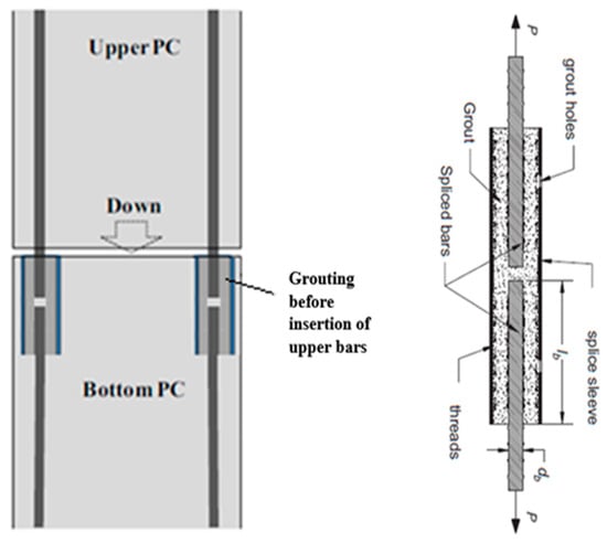 In this connection system, sleeves (coupler) are inserted into the lower pile segment and are connected to the upper segment by splicing steel reinforcement. The space between the bars and sleeve is filled with grouts. There are different types of couplers available on the market, which include shear screw couplers, headed bar couplers, grouted sleeve couplers, threaded couplers, and swaged couplers [17,57,58,59]. The most common type of mechanical couplers are grouted splice couplers, as shown in Figure 19 [60].