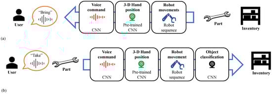 The use of Deep Learning has the potential to push collaborative human–robot systems to new frontiers. The integration of several CNNs working together in a collaborative task allows one to broaden the range of capabilities. For instance, with the use of voice commands, users are able to perform activities while waiting for an object to be brought or stored. The use of flexible routines and tasks, as seen in [52,53], would enable adaptable routines according to specific application needs.