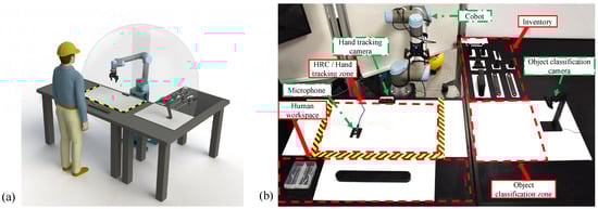 A Universal Robots® UR5e cobot (Odense, Denmark) was used as the main platform. For this purpose, it was necessary to design a layout where the cobot is able to interact with the operator and with parts of a proposed assembly. The layout was designed considering the workspace of an 850 mm radius around the cobot. Figure 2a depicts the computational model of the layout, while Figure 2b shows the experimental layout employed. Additionally, the delimited regions for cobot operation, object storage, object classification, human assembly, and human–robot interaction can be observed. Within the inventory, each object has its own storage area.