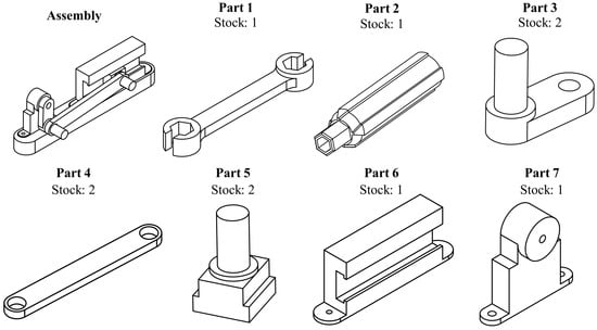 The operator is asked to complete a specific task in collaboration with the robot. The task consists of the assembly and disassembly of a connecting rod–crank mechanism. The user can request the system to bring or store the parts in the inventory. All these parts are shown in Figure 3, along with the stock for each part and the full assembly. They were all designed in SolidWorks 2022® (Dassault Systems, Vélizy, France) and later manufactured with fused filament fabrication on a FlashForge® creator pro printer (Zhejiang, China) using PLA.