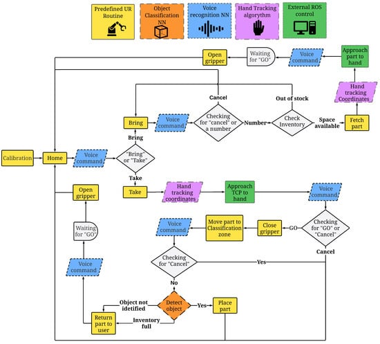 Figure 4 illustrates the various steps and systems involved in each routine. The main loop of the system begins when it expects a “bring” or “take” voice command in the position called “Home”. The cobot receives the information from the ROS system through the digital inputs in the control box. Digital signals are sent when voice commands are detected and when objects are classified within the storing sequence (discussed in Section 3.3 and Section 3.4).