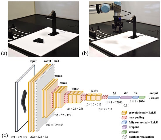 A Logitech® C910 camera (Lausanne, Switzerland) was used as the input for the system, as shown in Figure 5. Figure 5a exemplifies the position in which parts were photographed for classification, as well as the setup used for both the training and classification images. Figure 5b shows the robot retrieving the object after it was properly classified. Once the image was captured, data processing was carried out simultaneously in a Python3 script as follows. The images were captured using the OpenCV library. Subsequently, the images were resized to the desired dimensions of 224 × 224 pixels, which were designated for the design of data pipelines. And finally, contrast and brightness were modified from the captured images. These preprocessing steps allowed us to enhance the differences between objects, enabling the identification of small differences that distinguish the parts.