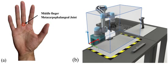 (a) The Metacarpophalangeal Joint (MCP), located in the hand of the user, can be located to allow for hand tracking. (b) Robot–Human collaboration/hand-tracking zone.