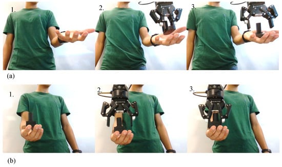 The robot is commanded to move to the position of the MCP joint as long as it is detected within the allowed volume. It uses the Inverse Geometric Model (IGM) of the robot to calculate the joint-based movements. Figure 8 exemplifies the application of the hand-tracking subsystem, in Figure 8a for bringing a part and in Figure 8b for taking and storing the part.