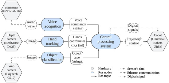 Figure 9 presents the CPS node, designed to receive three inputs: hand position coordinates, recognized voice commands, and the class of the detected object. The CPS node processes these data and transmits signals to the cobot, enabling control over its inner program routines. To facilitate precise control of the movements performed by the cobot, the UR ROS Driver library was used to guide the end effector toward the desired hand position. UR ROS Driver is an ROS library used to control a Universal Robots® cobot; this library contains communication functions that allow one to send movement commands via ROS topics to the cobot. For signal transmission, digital signals are sent to the cobot via digital inputs.